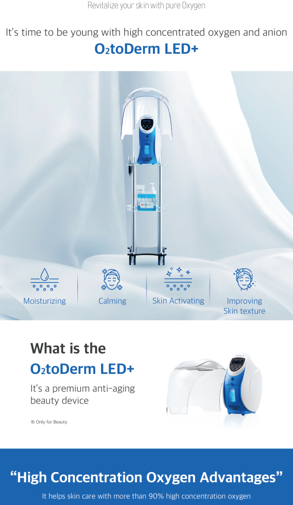 Oxygen is an essential element for our ability to breathe and our body to function optimally. It is also essential to regenerate damaged cells and decompose lactic acid. O2 to Derm produces up to 92% pure oxygen, making skin respiration better, rejuvenating the skin, and achieving anti-aging results. It improves the skin’s ability to reproduce collagen to improve signs of aging. It eliminates ROS aka Reactive Oxygen Species, which is a primary source of skin aging.