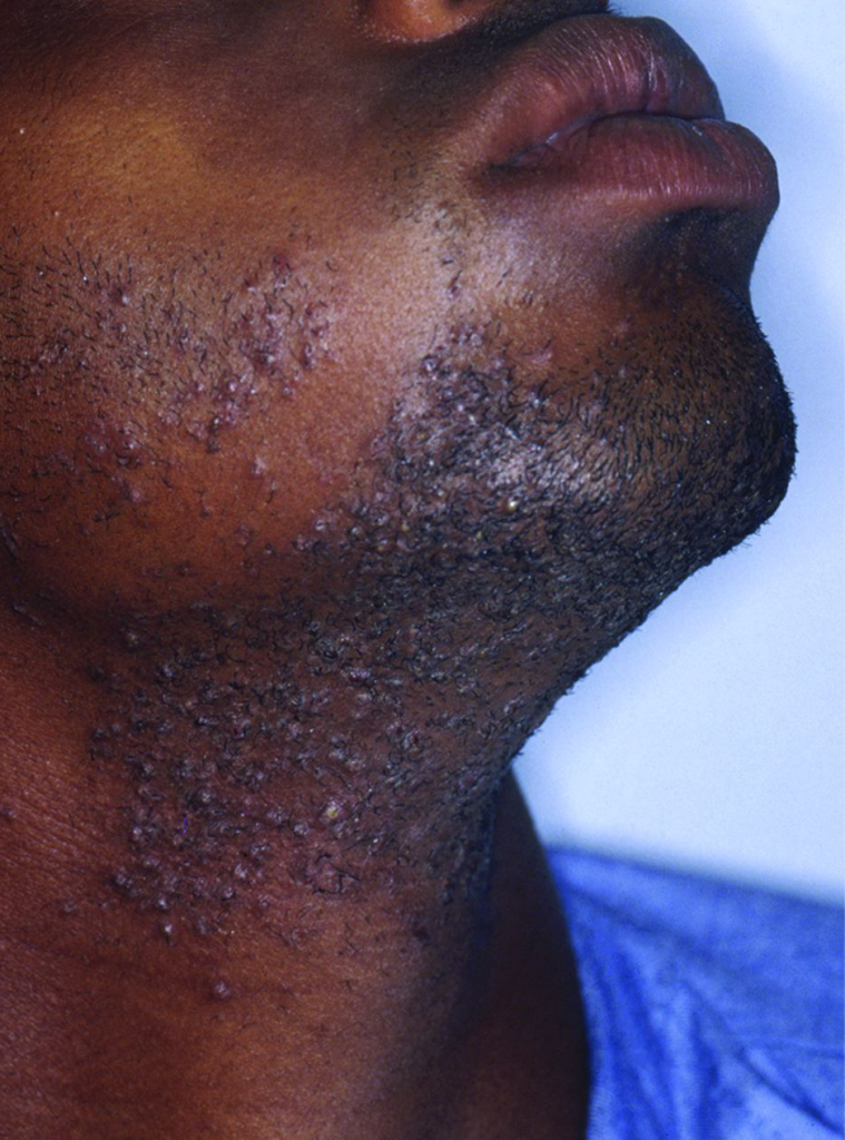 Pseudofolliculitis Barbae, commonly known as razor bumps or ingrown hairs, is a dermatological condition that occurs primarily after shaving. It is characterized by the development of inflamed, red, and painful bumps, often resembling acne, along the beard area, neck, or other areas subjected to shaving.